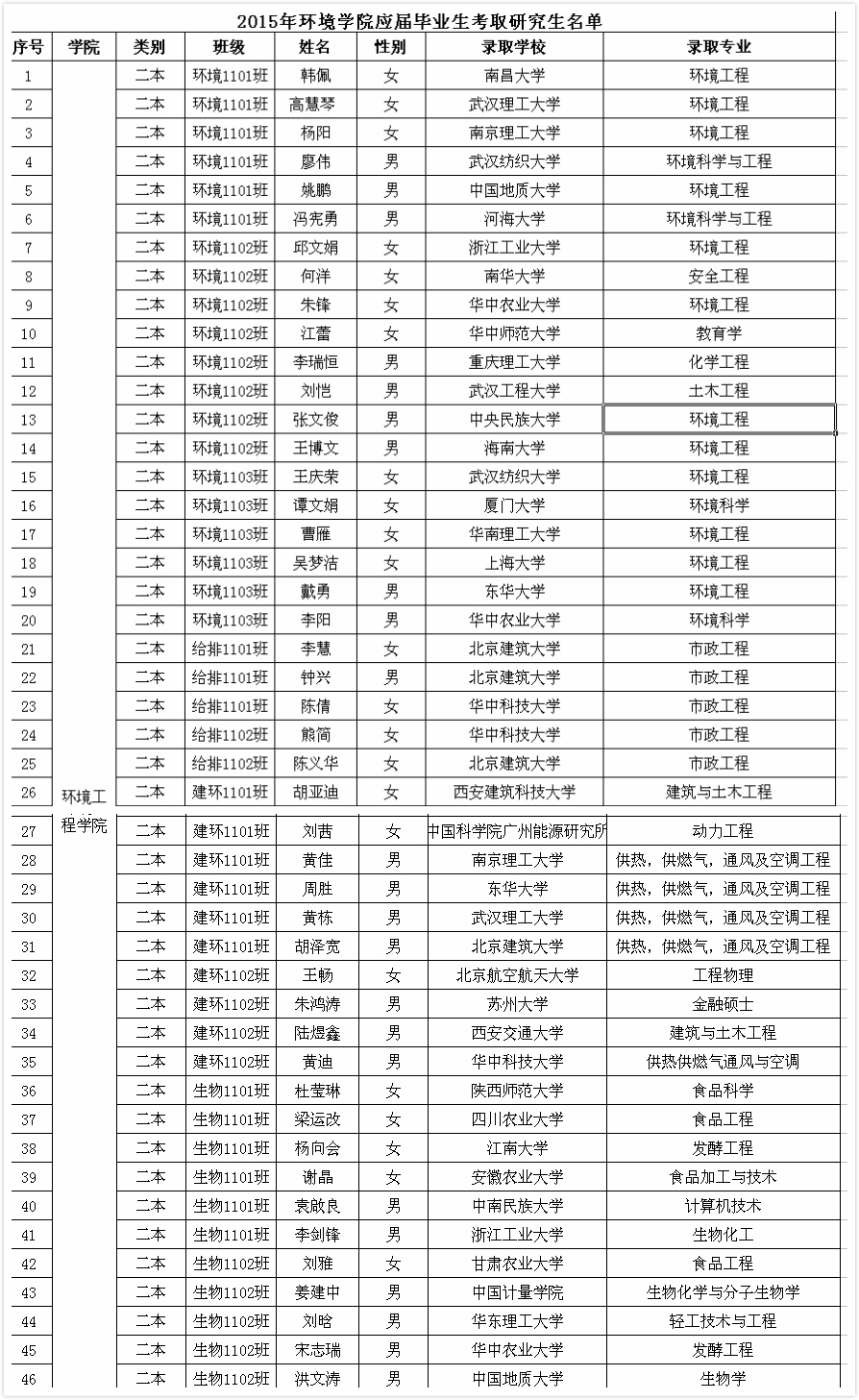随着2015年考研复试陆续结束,环境学生考研学子也陆续向学院报来喜讯,考研录取率、上线率、报录率均比去年有所提升。今年共计82人报考,上线63人,上线率达到76.83%,46名同学最终被录取,17名同学放弃调剂,报录率56.10%,考研录取率为18.47%。