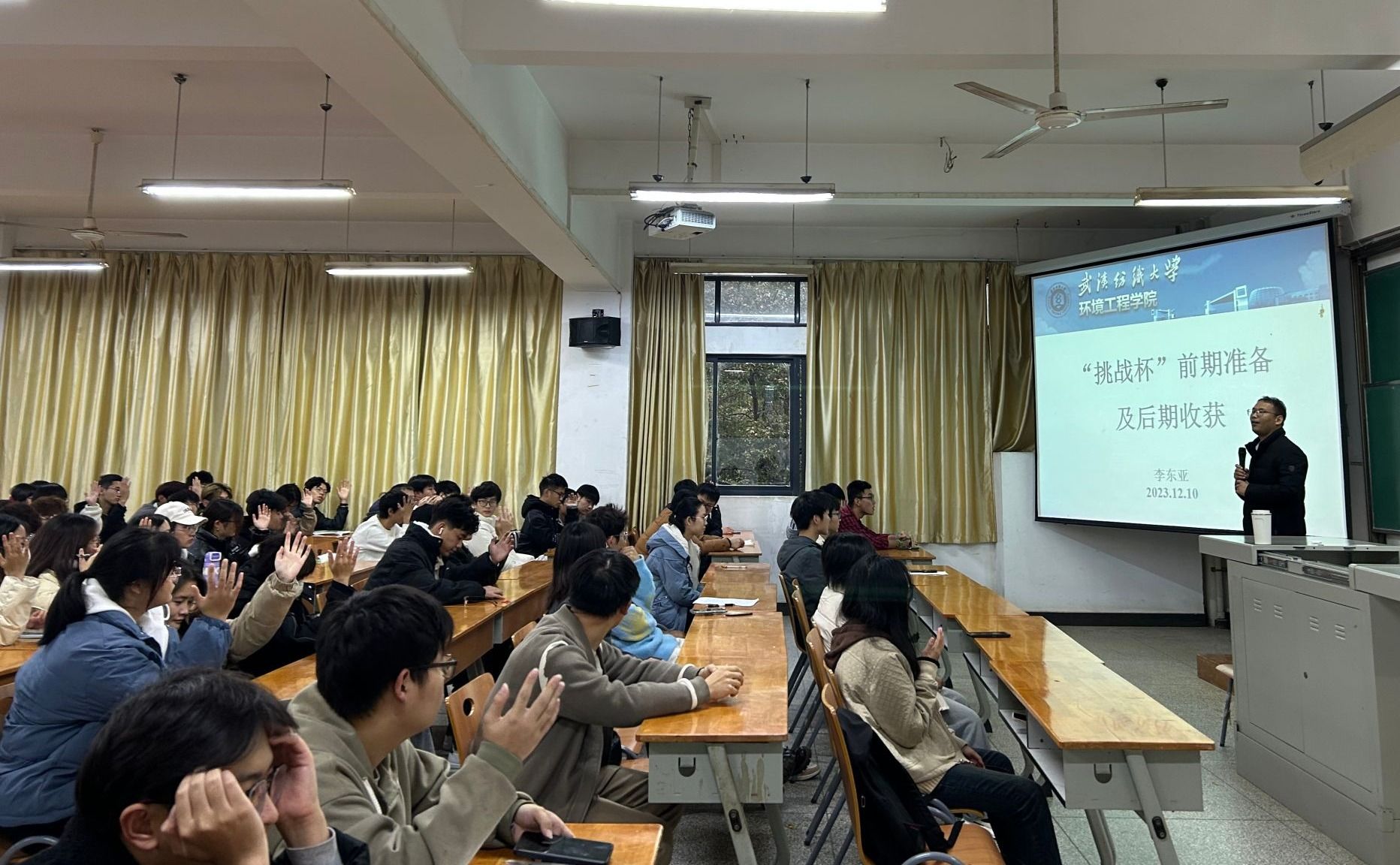 2023年在纺大教室,李东亚为本科生作“挑战杯前期准备及后期收获”主题报告
