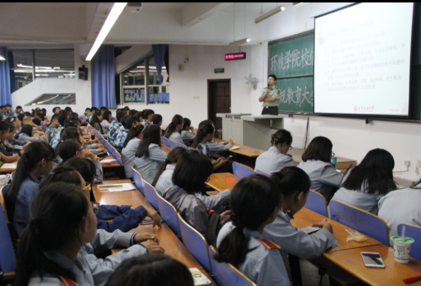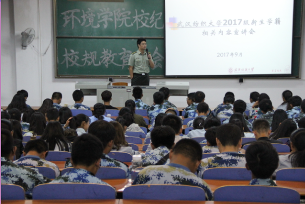 2017年9月29日晚,环境工程学院17级新生辅导员刘文祥老师在03-T101教室为全院新生召开校规校纪教育大会。