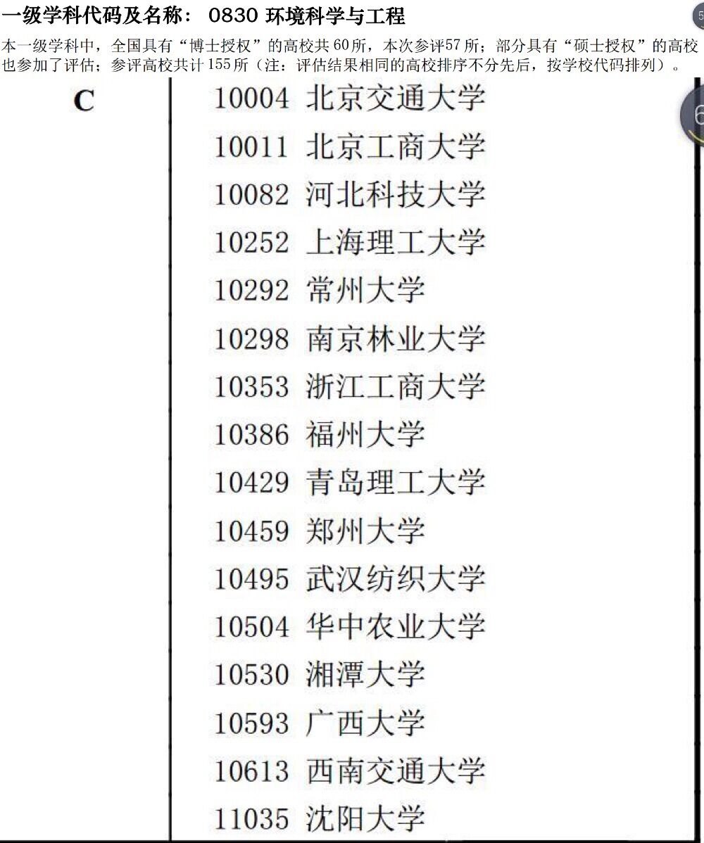 学科评估是教育部学位与研究生教育发展中心按照国务院学位委员会和教育部颁布的《学位授予和人才培养学科目录》,对具有博士和硕士学位授予权的一级学科进行的整体水平评估。在本次学科评估中,“环境科学与工程”一级学科中,全国具有“博士授权”的高校共60所,本次参评57所,部分具有“硕士授权”的高校也参加了评估,共计155所。