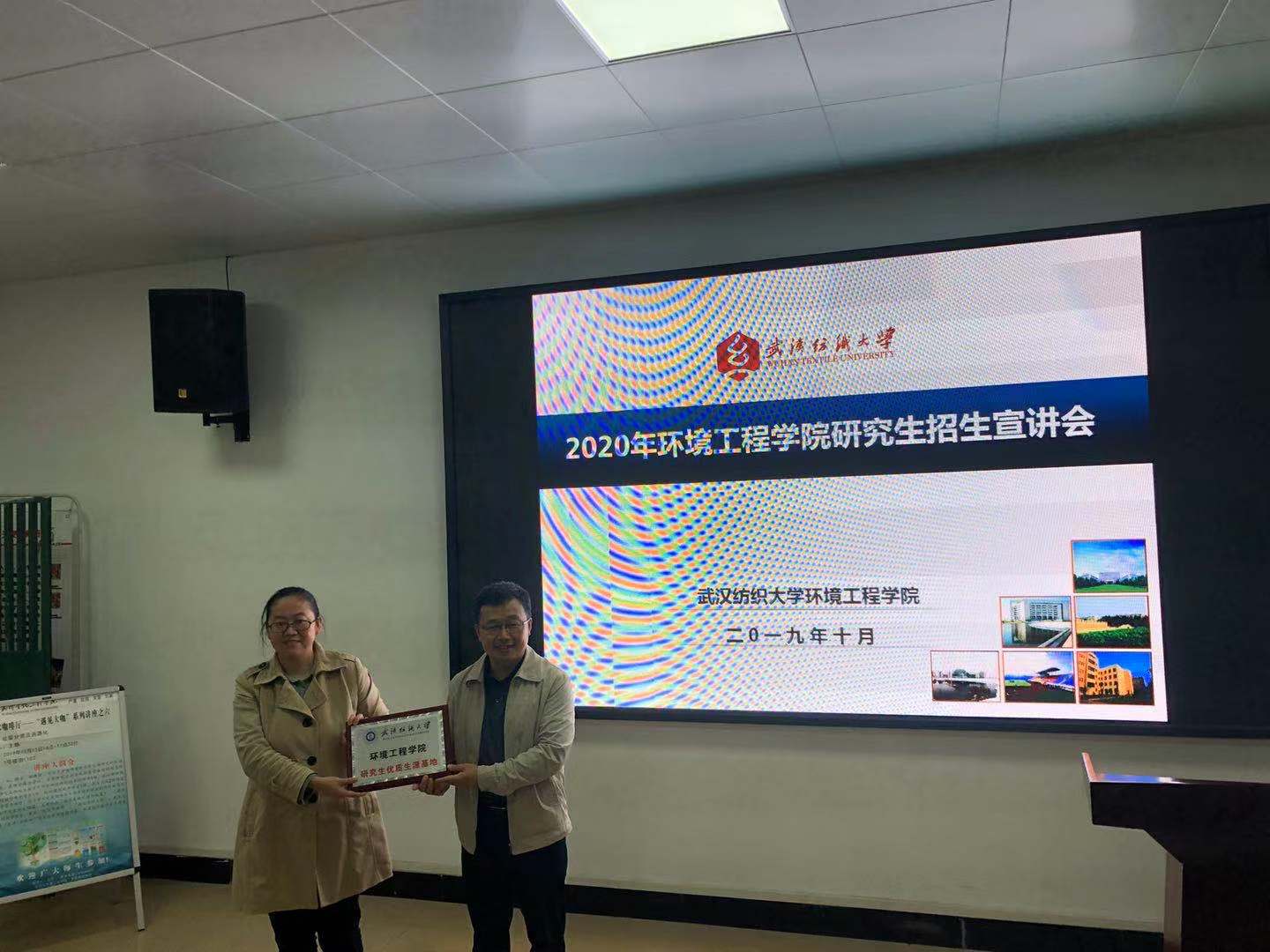 2019年10月16日,我院夏东升院长、潘飞副院长等一行赴武汉生物工程学院进行了我院2020年研究生招生宣传工作,潘飞副院长进行了招研究生招生宣讲,夏东升院长进行了我院优质生源基地授牌,并开展了毕业生回访,看望了在此工作的2012级毕业生陈欣。