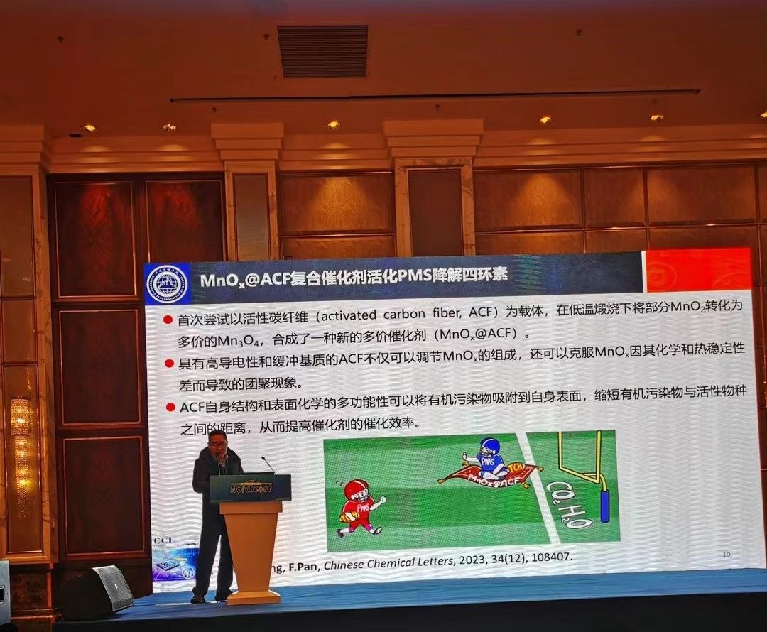 我院潘飞教授受邀在“环境功能材料”分会论坛作了题为“锰系材料激活过硫酸盐体系的构建及其机制研究”的学术报告,主要分享了近年来活性炭纤维在水处理工艺方面的研究。报告受到了在场学者的一致好评,潘飞教授还针对与会者的提问进行了细致的回答,并期待与其它机构加强学术合作。
