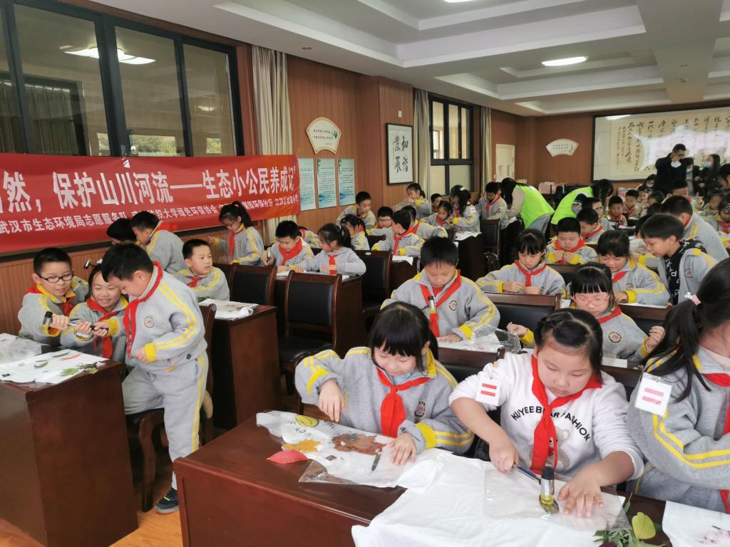 什么是环保,哪些属于环保行为?什么是湿地,武汉有哪些湿地?在“植物敲拓染”开始前,市生态环境宣教中心老师给孩子们上“环保课”,小朋友三五成组,坐在教室里观看环保题材电影,听长江大保护的故事,看大象奇遇记,边听边谈感想,汇成一场“生态小公民养成记”活动,展现出孩子们眼中“人与自然和谐共生”的美好愿景。