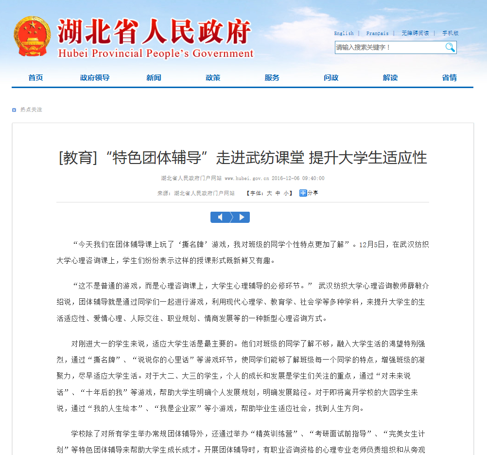 学校除了对所有学生举办常规团体辅导外,还通过举办“精英训练营”、“考研面试前指导”、“完美女生计划”等特色团体辅导来帮助大学生成长成才。开展团体辅导时,有职业咨询资格的心理专业老师负责组织和从旁观察,对于在团体辅导中表现出来的不合群、焦虑、抑郁的学生进行记录,并且进行个别访谈。