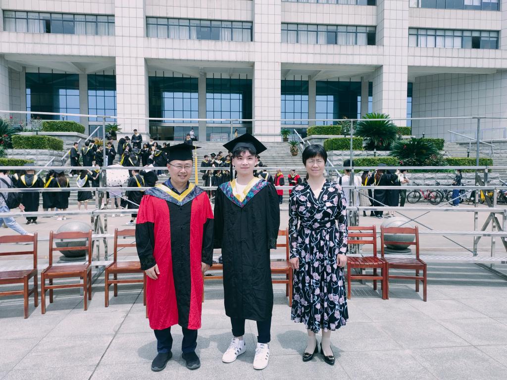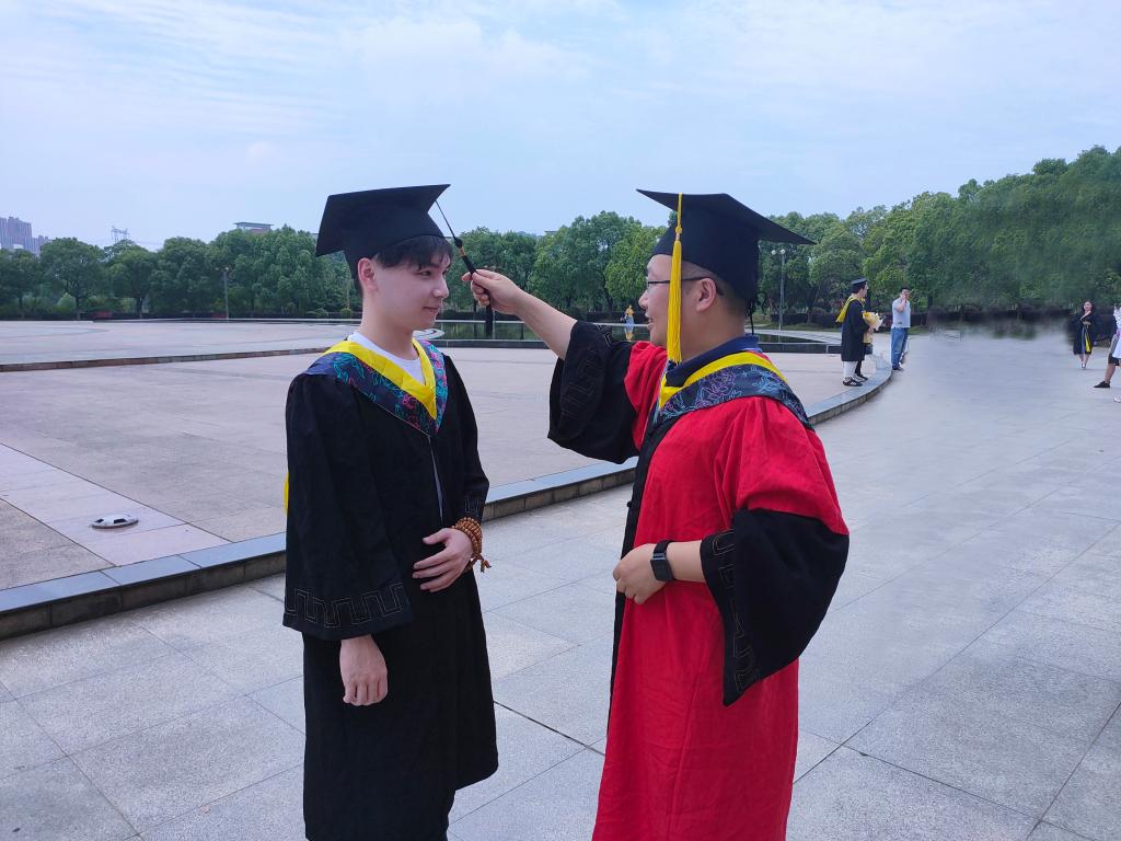 拍照现场,当学院院长夏东升、书记谢晓萍见到刘行韬时,十分关心他的近况和未来的打算。当得知他有攻读完博士学位的想法时,鼓励他发愤图强、学好本领,将来更好地回报祖国和社会,并亲切的为他拨正流苏、合影留念。