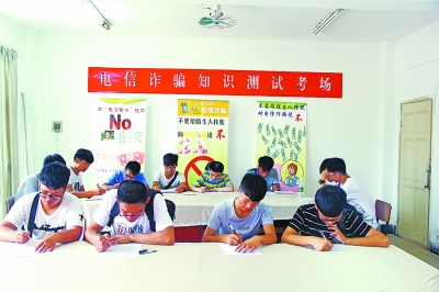 记者昨天在现场看到,安全意识考场就设在迎新点旁边,50名新生正齐刷刷作答,考场内悬挂的“电信中奖是诈骗,安全防范我当先”的红色条幅格外醒目。当日,该院286名新生都必须参加考试。
