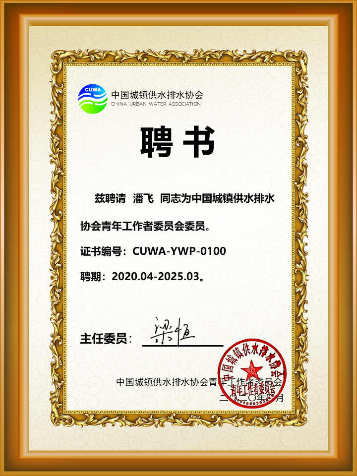 2020年4月20日,中国城镇供水排水协会青年工作者委员会(以下简称“中国水协青年委”)成立大会(视频会议)在哈尔滨工业大学召开。来自中国城镇供水排水协会、高等院校、科研院所、供排水运营单位、环保企业等117家单位的180余名嘉宾参加了本次视频会议,会议主会场设在哈尔滨工业大学城市水资源与水环境国家重点实验室。我院潘飞老师当选中国水协青年委委员。