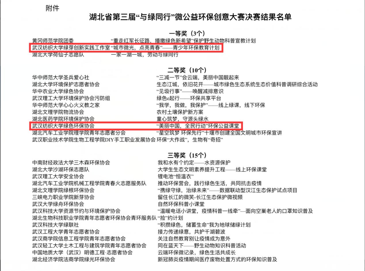 近日,湖北省生态环境宣传教育中心公布了第三届“与绿同行”微公益环保创意大赛决赛结果,williamhill绿色环保协会的“‘城市微光,点亮青春’——青少年环保教育计划”和“‘美丽中国,全民行动’环保公益课堂”分别获得大赛的一等奖和二等奖。