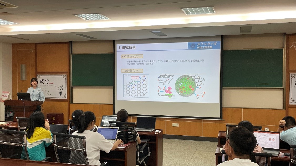 王炜珊同学通过调控生物炭中sp2杂化的相对含量,使电子更容易发生跃迁并抑制电子复合,从而提高生物炭的光热转换性能。该技术可有效使用废水产生清洁水,实现有机高盐废水的低碳排放处理及资源化回用。张一鸣同学通过氧化铁的非金属掺杂调控,以提高过硫酸盐催化过程中的界面电子转移速率,实现对污染物的高效降解。形成的新活性位点与污染物相互作用,调控了催化路径,具有良好的环境适应性,为开发高活性铁基材料提出了新的策略。吴莉同学研究在碳化氮上构建B、Cu电子键桥形成局部极化电场,加速类芬顿中界面电子转移速率,从而废水中污染物的降解速率提升了16倍。该体系具有良好的水体适应性及稳定性。