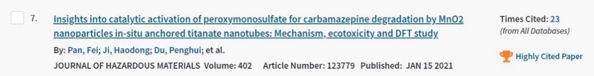 近期,根据ESI(基本科学指标数据库)最新数据显示,环境学院潘飞老师2021年发表于环境科学与生态学领域TOP期刊Journal of Hazardous Materials的研究成果《Insights into catalytic activation of peroxymonosulfate for carbamazepine degradation by MnO2nanoparticles in-situ anchored titanate nanotubes: Mechanism, ecotoxicity and DFT study》入选了由Web of Science识别的高被引论文。该论文以williamhill为第一完成单位,潘飞为第一作者。