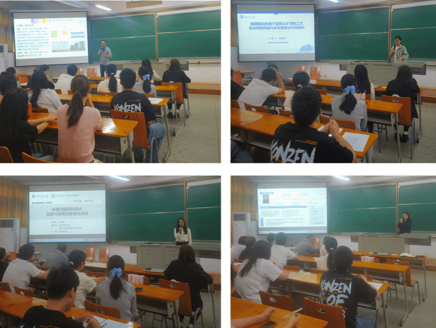李东亚教授做“工业废水深度处理研究及应用”主题报告,讲述了将铁基高级氧化技术应用于实际工业废水治理的过程;刘静欣副教授做“数据驱动的离子型稀土矿浸取工艺多参数协同作用解析与优化模型构建”主题报告,介绍了利用构建典型数据库,同时运用AI技术,优化完善离子型稀土矿浸取的工艺;景冰花博士做“环境功能材料设计及新污染物高级氧化消减”主题报告,介绍了通过理论模拟计算优化环境功能材料在高级氧化技术去除新污染物过程的相关研究;贾欢欢博士做“二次电池体系中的固态电解质、隔膜设计及构效关系研究”主题报告,介绍了二次电池体系中固态电解质、隔膜的设计优化过程。