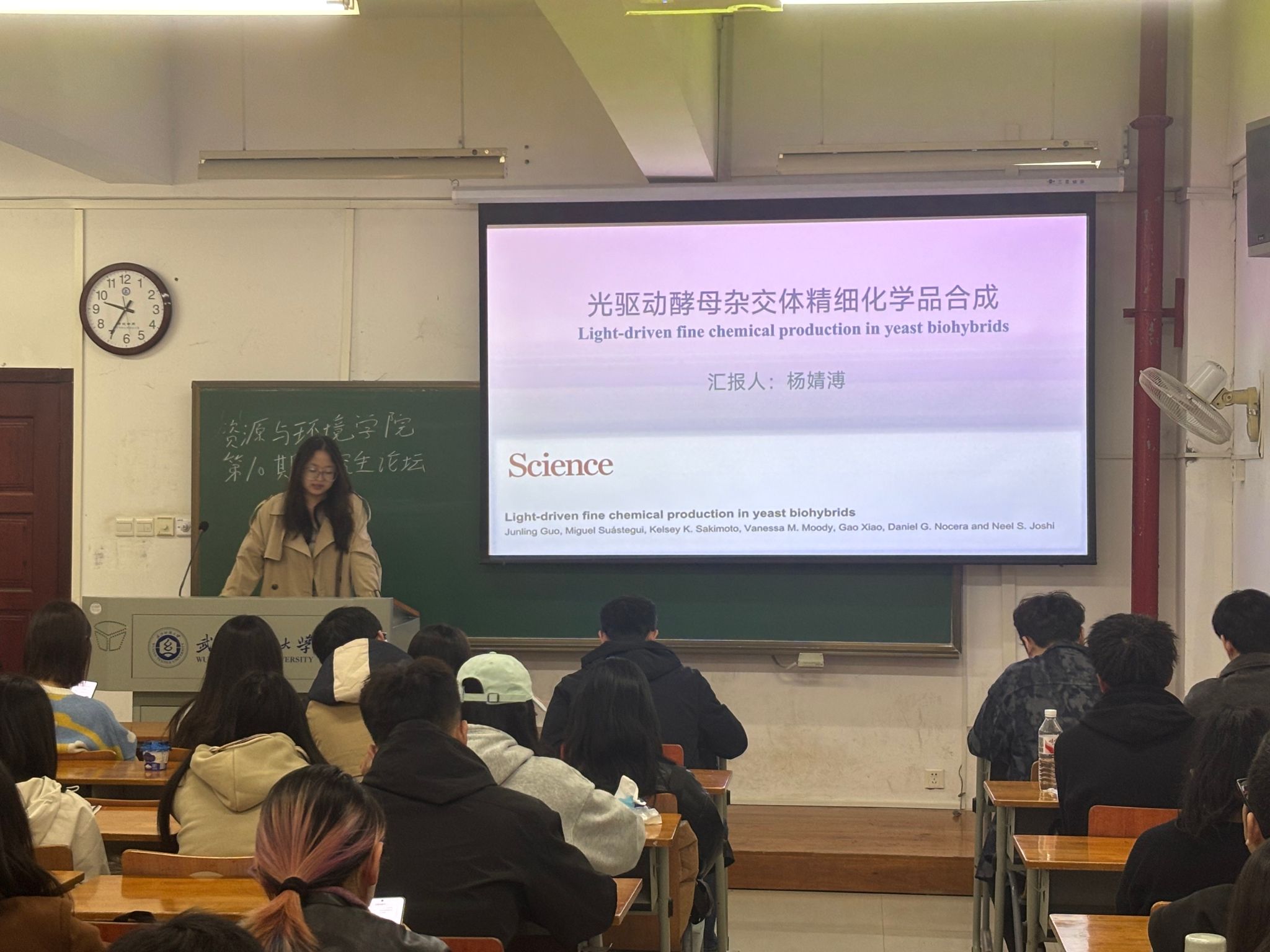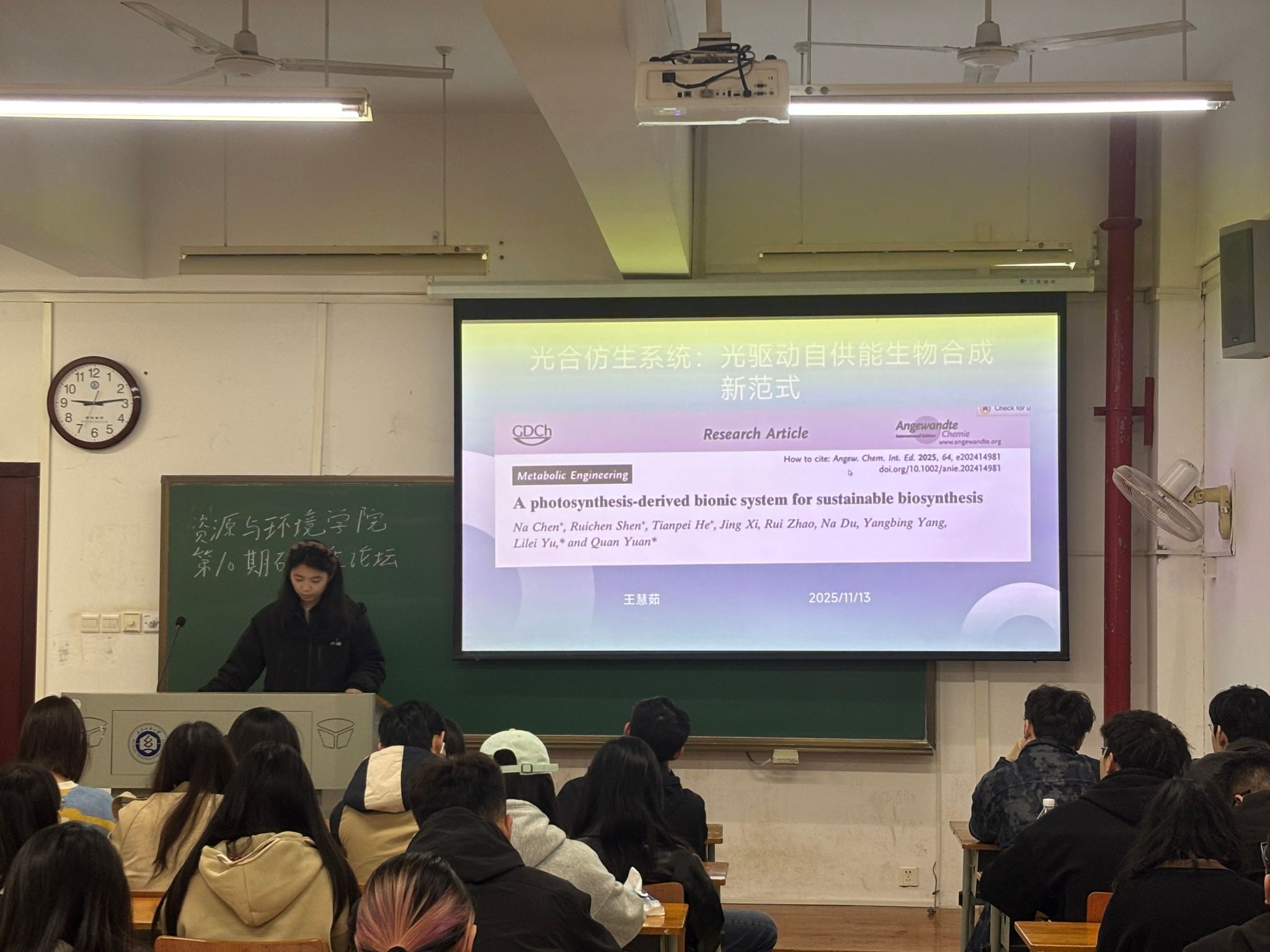 王慧茹同学探讨了该研究受自然光合作用启发,设计了由光诱导电子模块、电子转移通道模块和质子梯度模块组成的光驱动仿生系统。其核心是通过缺陷调控和能带结构工程等策略,实现NADPHATP的同步可控供应,解决微生物代谢中二者不足的问题。实验表明,该系统能显著提升沼泽红假单胞菌的CO2固定效率和番茄红素生物合成效率,电子转移效率高达90.8%,光子转化效率提升1.6倍。该系统还适用于大肠杆菌等菌株,为可持续生物制造、CO2减排提供了新路径。