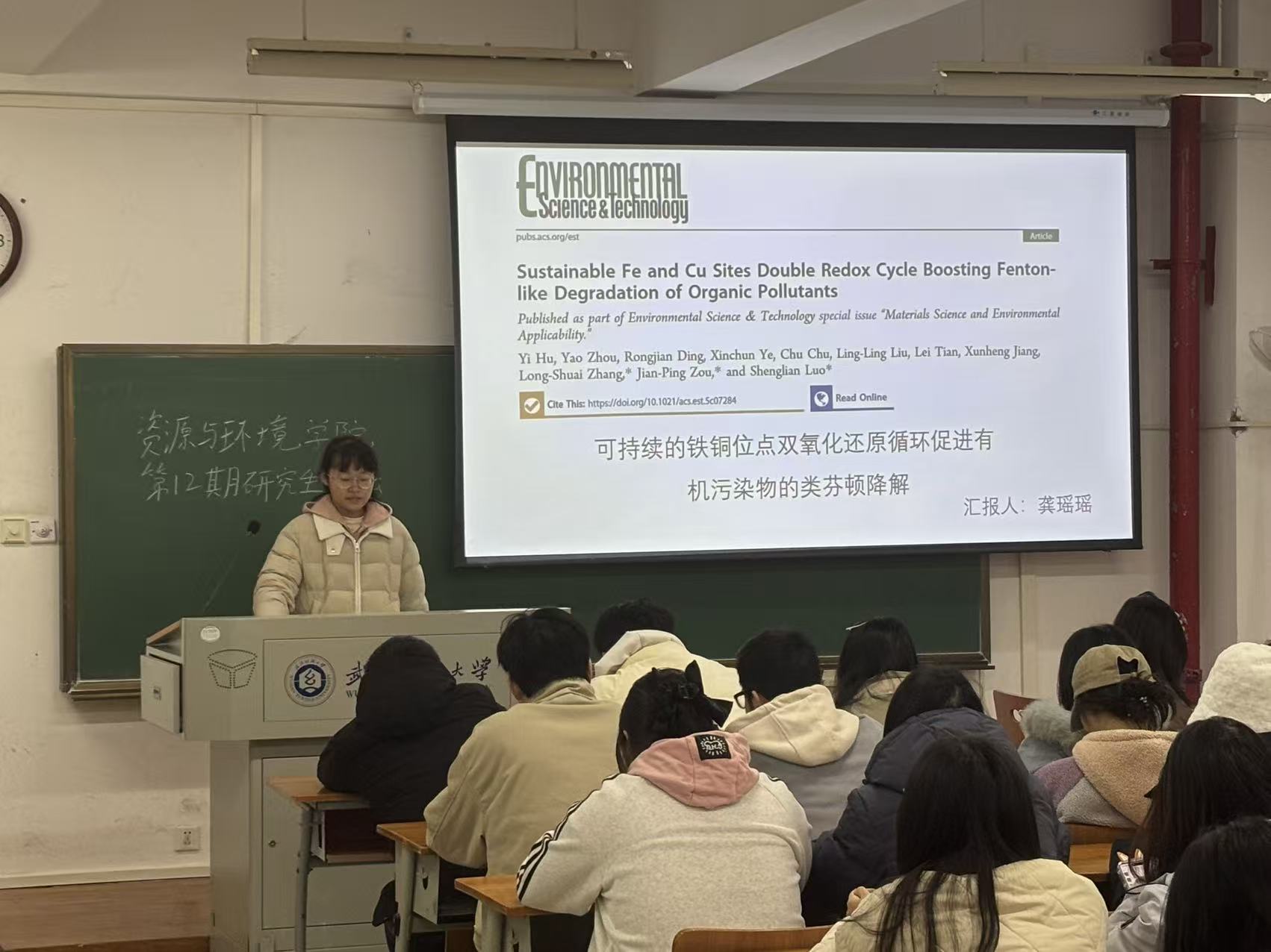 龚瑶瑶同学探讨了“可持续的铁和铜位点双氧化还原循环促进有机污染物的芬顿样降解”,研究设计了一种具有不对称N4−Fe−Cu−N3配位结构的双金属催化剂(FeCu-CN),如何通过内源电子转移机制实现了Fe(III)/Fe(II)与Cu(II)/Cu(I)双氧化还原循环的自驱动。并探究催化剂中Cu位点作为电子中继枢纽,协同增强了对H2O2的活化,促进了·OH和·O2-的生成,并通过电子穿梭机制形成闭环反应体系,显著提升了磺胺甲噁唑(SMX)等有机污染物。