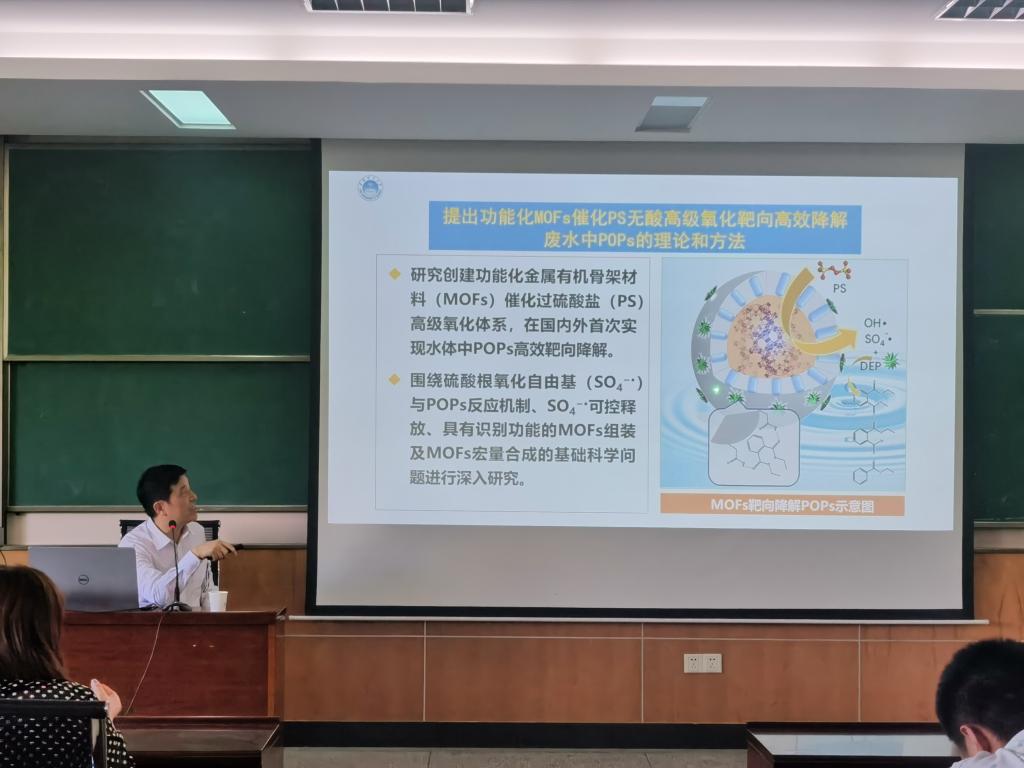 夏东升院长代表学院对万金泉教授的到来表示热烈的欢迎,并简要介绍了其研究方向和科研成果。万金泉教授以“废水中持久性有机污染物的高效降解机制及方法”为题目,报告了废水中持久性有机污染物(POPs)对水处理及生态环境的影响现状,围绕采用过硫酸盐(PS)无酸高级氧化技术深度降解POPs的基础科学问题,从硫酸根氧化自由基(SO4−•)与废水中POPs的降解关系、SO4−•的可控释放、具有靶向识别功能MOFs催化剂的组装及MOFs宏量合成四个方面进行深入探讨。报告对于加深人们对废水中POPs的深度消除的科学认识具有重要意义。该报告深入浅出、精彩纷呈,参与的相关教师和学生开展了热烈的讨论,为师生提供了一次难得的学习和交流机会,有助于师生进一步了解废水处理领域的前沿动态,开拓学术视野。