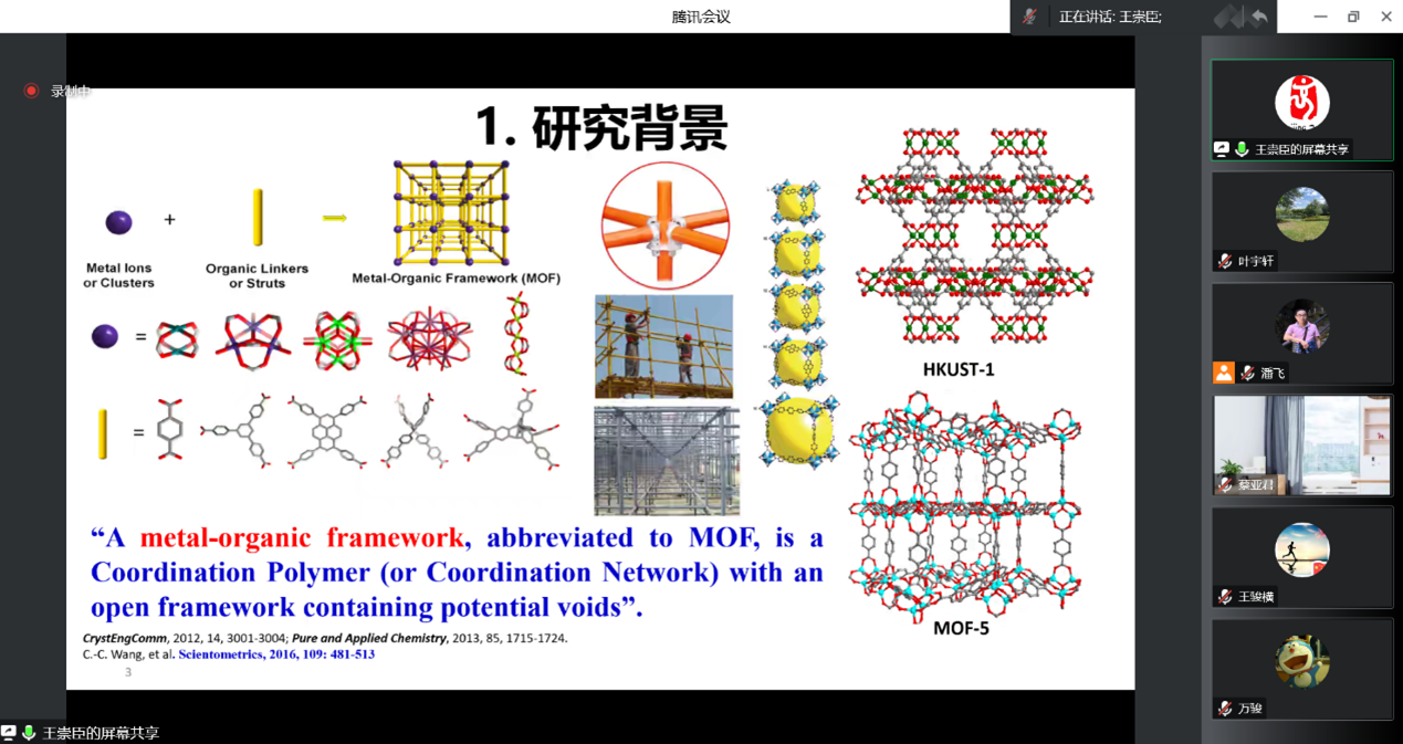 11月30日下午,环境工程学院在线上举办第271期阳光论坛。本次论坛邀请了北京建筑大学王崇臣教授作了题为“MOFs基环境功能材料:研究进展、思考与展望”的报告。论坛由院长潘飞教授主持,学院教师和研究生参与了此次论坛。