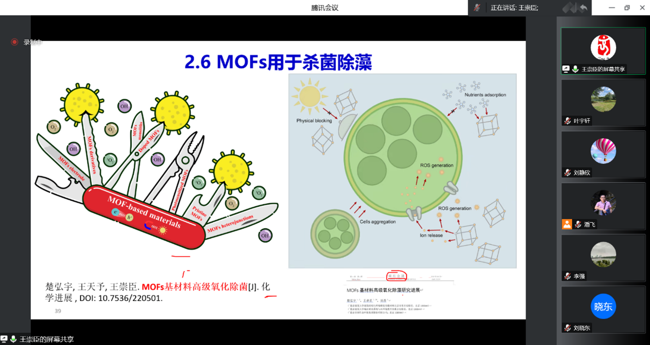 王崇臣教授从MOFs材料的研究背景、研究进展以及研究展望三方面展开,分析了MOFs及其衍生物、复合物作为环境功能材料在水处理过程中的关键科学问题;结合课题组的研究,介绍了MOFs环境功能材料在光催化还原Cr(VI)方面的应用,探究水中共存有机物的影响,阐明Cr(VI)还原及总Cr的去除机理;在环境催化方面,建立基于MOFs及其复合物的高级氧化体系,成功应用于水中新型污染物的去除,并通过一系列分析表征手段,识别MOFs材料活化双氧水、过硫酸盐等氧化剂的活性位点;开发多种MOFs材料,深入探究其对水体污染物的吸附特性及机理;同时,还将MOFs材料用于水体抗菌和除藻,极大扩展了该类材料的应用范围。此外,王崇臣教授结合自身科研失败的经历,鼓励青年老师和学生要善于发现科研亮点,切换科研思路,寻求突破口。