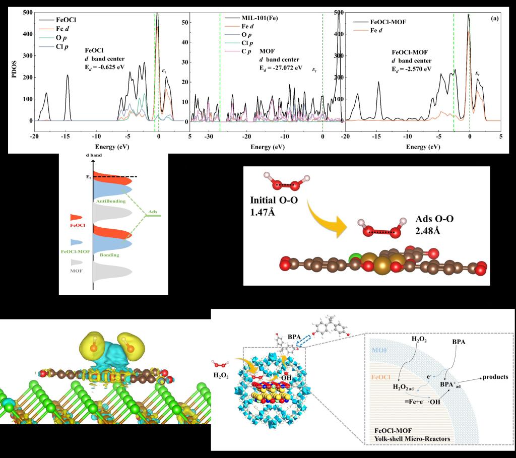 这项工作首次通过FeOCl原位生长封装在金属有机框架(MOF)中作为蛋黄壳反应器(FeOCl-MOF)。FeOCl与MOF之间的相互作用不仅增加了FeOCl的电子密度,而且使d带中心下移。FeOCl电子密度增加可以促进H2O2向·OH转化。并且d带中心向较低能级偏移有利于·OH解吸附和释放。实验和理论计算表明,较高的催化性能归因于独特的蛋黄壳结构,将催化和吸附位点集中在一个限域空间内,以及电子密度和d带中心的改善,以实现·OH高效生成、快速解吸和就近利用。其利用表面MOF吸附有机污染物,从而大大提高了H2O2和·OH有效利用率(从25.5%(Fe2+/H2O2)到77.1%(FeOCl-MOF/H2O2))。此外,还构建了连续流反应器,以实现有机污染物的连续安全处理。这项工作提供了一种Fenton-like微反应器,用于高效生成、快速解吸和就近利用·OH来改善复杂环境中的水净化技术。