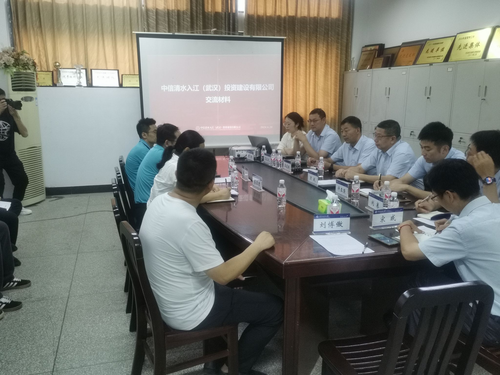 院长潘飞代表学院对万斌一行的到来表达了热烈的欢迎,并介绍了学院的相关情况。万斌代表中信清水入江(武汉)投资建设有限公司对学院的热情招待表示感谢,并介绍了公司的发展历史,基本情况以及江夏污水处理厂相关情况。双方就实习基地建设,就业岗位提供,污水处理技术等方面进行了深入探讨交流。