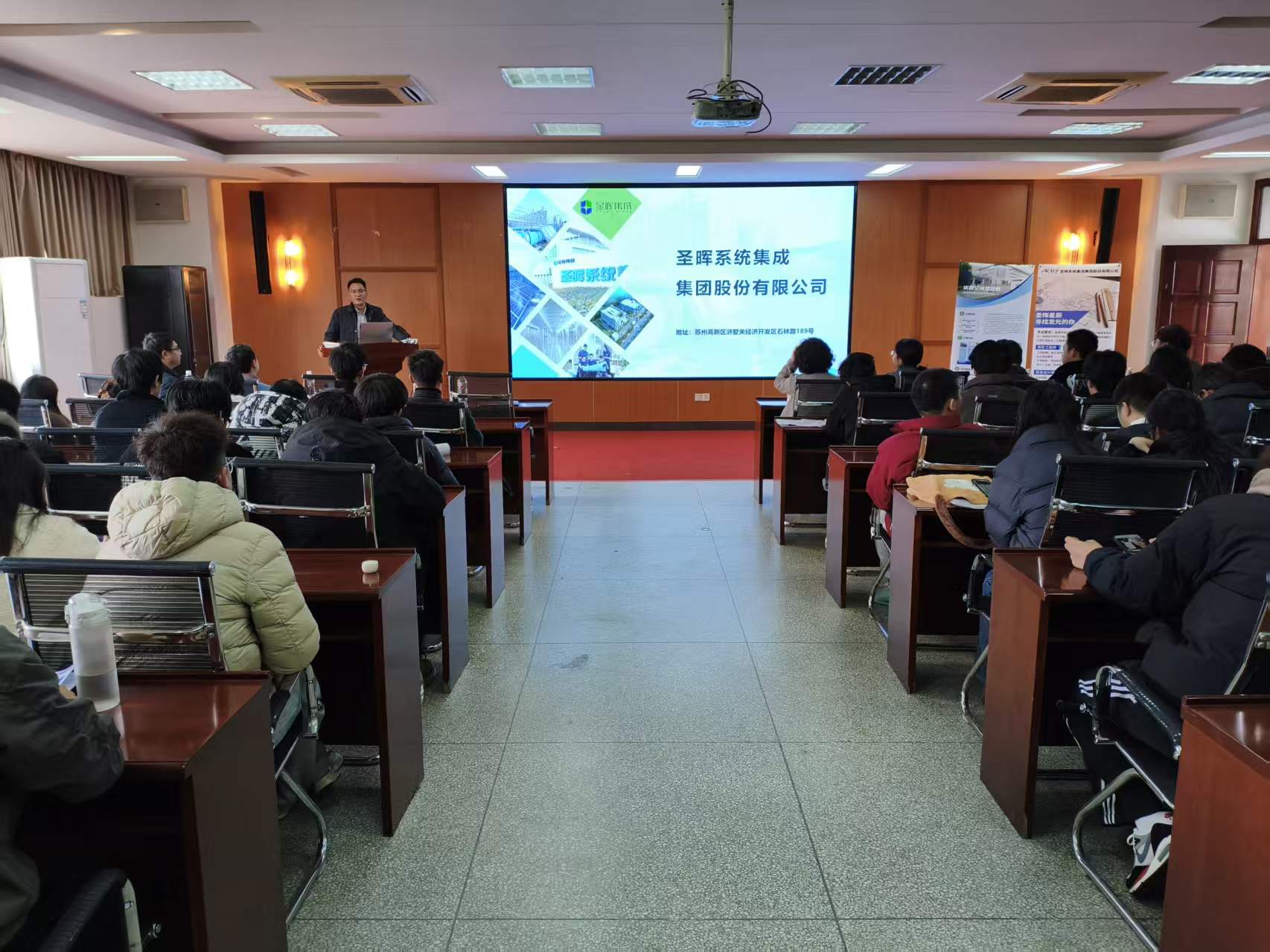 讲座伊始,周雄健协理对圣晖集团的发展历程、核心业务板块及技术优势进行了系统介绍。他结合企业在洁净工程、机电整合、绿色能源等领域的标杆项目,生动阐释了集团如何以技术创新驱动高质量发展,并展望了相关行业对复合型人才的迫切需求。