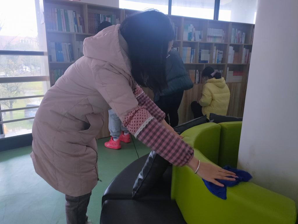 3月4日,在“学雷锋”日到来之际,环境学院党员志愿者,早早带上清扫工具,主动来到学院开放书吧开展志愿服务活动,他们对图书进行了分门别类整理,把地面打扫的干干净净,以的焕然一新迎接新学期。