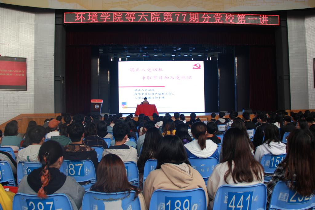 4月11日,环境工程学院、化学与化工学院、电子与电气工程学院、外国语学院、数学与计算机学院、技术研究院六院联合,在大学生活动中心演播厅举办第77期分党校开班典礼暨第一次党课,环境学院党委书记谢晓萍同志为主讲人,共453名学员参加了此次党课。