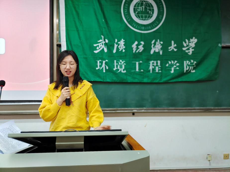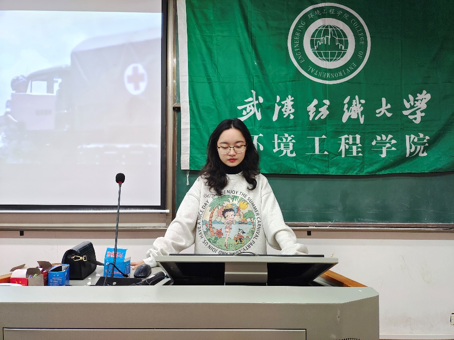 课程第二项2019级梁露馨为大家详细讲述了学院里大家身边的先进典型;如,疫情期间18级张丹妮主动走在抗疫最前线,用自己的热血温暖着被疫情困扰的人18级周帆主动请缨,作为应急民兵参加镇江江心洲抗洪救灾,不畏艰险和抗击灾情的官兵一,不眠不休坚守救灾一线值得一提的是21级新生贺美娇,暑假期间主动充当防洪宣传员,向群众义务普及防洪防汛知识。这些事例,充分体现了纺大校训中的“自强不息”精神,展示了环境学院学子青春风采。