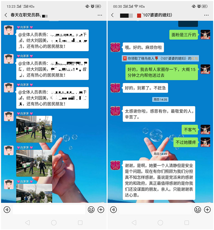 一位居民在给我留言时说:“有你们帮忙照顾老人,真不知如何感谢,感谢党和政府,但最想感谢的是你——还没谋面的朋友、亲人,只能谢谢表达心意”。(注:儿媳在外地,婆婆80多岁一人在此居住)