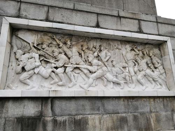踏上了最后一节台阶,站在高耸的革命烈士纪念碑前,望着碑上的“革命烈士纪念塔”七个大字,心中肃然起敬。塔体两侧刻有两幅浮雕,基底上刻有记载革命烈士历史功绩的碑文。浮雕和碑文向我们诉说着那令人难忘的年代,每一个烈士的背后,都有着令人无比震撼的故事,但每位烈士的目标都是一致的,都是为了人民的解放,为了新中国的成立!碑后的革命烈士墓成山丘状,我想后人们在碑前对先烈的尊敬和感激之情,先烈们也会感受到。
