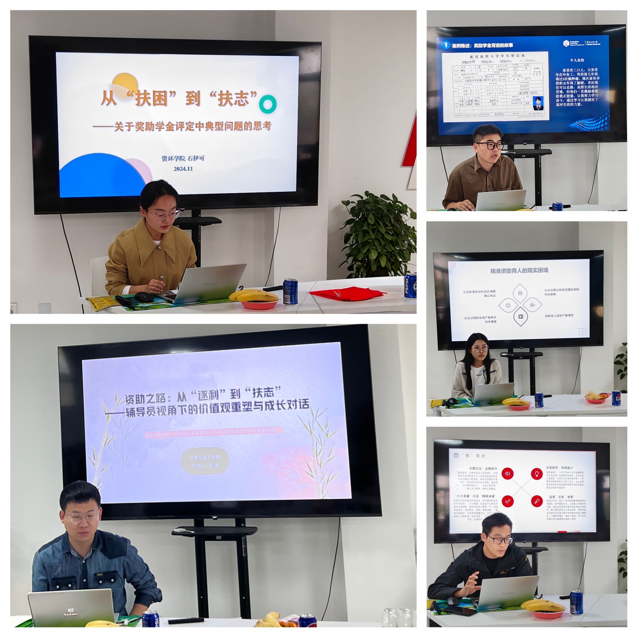 本次沙龙围绕“精准化资助育人的探索与实践”,六位老师结合具体案例,分享了评选办法与育人举措。资环学院石伊可以《从“扶困”到“扶志”——关于奖助学金评定中典型问题的思考》为题,通过对奖助学金评定中典型问题进行分析,提出了?的新思路。化工学院郭捷以《从“逐利”到“扶志”——辅导员视角下的价值观重塑与成长对话》为题,通过对资助工作开展过程中所遇到的反面案例进行分析,强调辅导员要重视引导学生审视金钱与价值观的关系,把握学生思想动态,确保资助工作的持续性与有效性。经济学院马晓雪以《资助育人:价值观引导与实践》为题,强调学生价值观引导的重要性和途径。传媒学院薛萍结合案例分析贫困生精准资助育人工作的实践路径,提出通过走访、谈心、家访、数据赋能等多种形式画像,精准帮扶。伯明翰学院方开进以《以奖助学金评选为契机,培养贫困生的责任与担当》为题,分享日常资助工作中所遇到的特殊情况,提出资助育人重在日常思想浸润,引导学生刻苦学习、勇于担当、回馈社会,回报国家;资环学院郁星以《尊重事实,正本清源,切实发挥资助育人功能为题》,从“怪”现状、“假”案例、“真”反馈、“实”建议四个方面分享了自己如何做好贫困生认定和助学金评选工作。