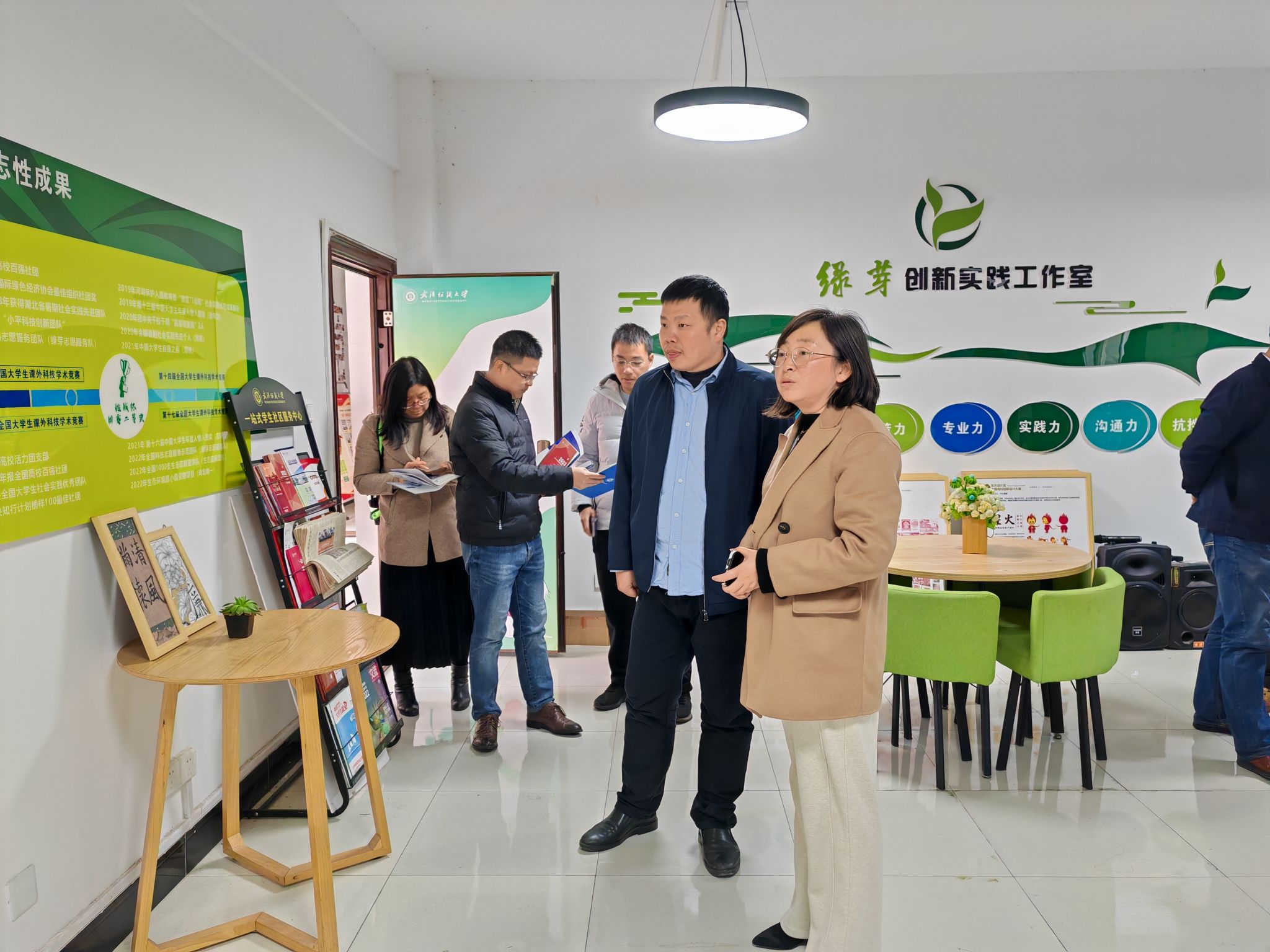12月12日上午,广州大学学生处学生社区党委专职副书记刘军、学生社区公寓管理服务中心李爱凤等一行四人来“绿芽”创新实践工作室调研交流。