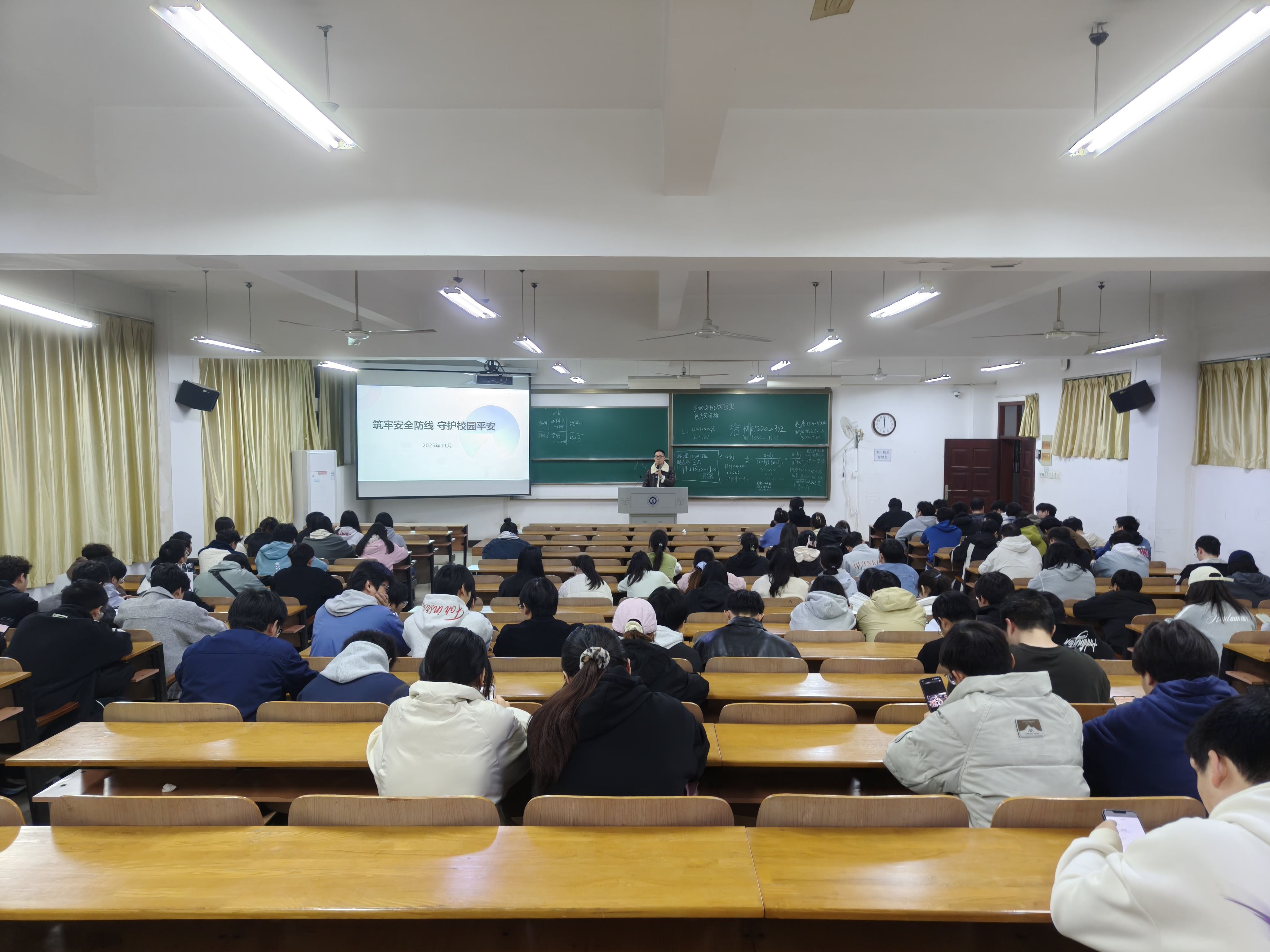 为增强学生安全意识,筑牢校园安全防线,11月9日,学院组织研究生及本科生各年级于崇礼楼开展了以“筑牢安全防线 守护校园平安”为主题的消防安全教育班会,全面普及宿舍消防安全知识,营造安全、和谐、稳定的校园环境。