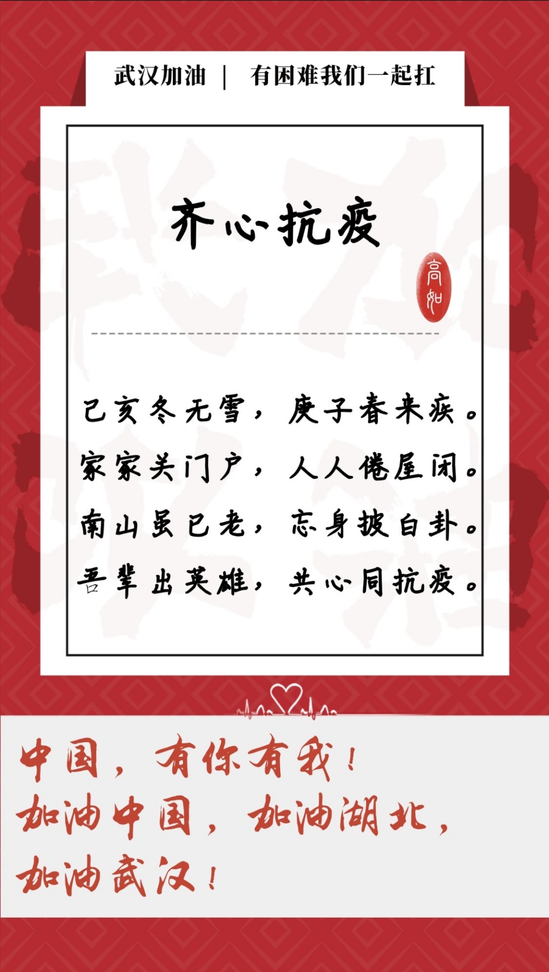 中国,有你有我。加油中国,加油湖北,加油武汉!