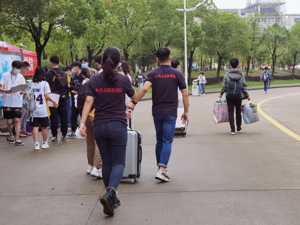 在迎新现场,有一支着装整齐的队伍在人群中穿梭,十分吸引眼球。学院建环全国党建工作样板支部,刚刚获批团省委本禹志愿服务队,由学生党员组成的“红色•忆思”服务队忙碌的做好引导、搬运行李服务。