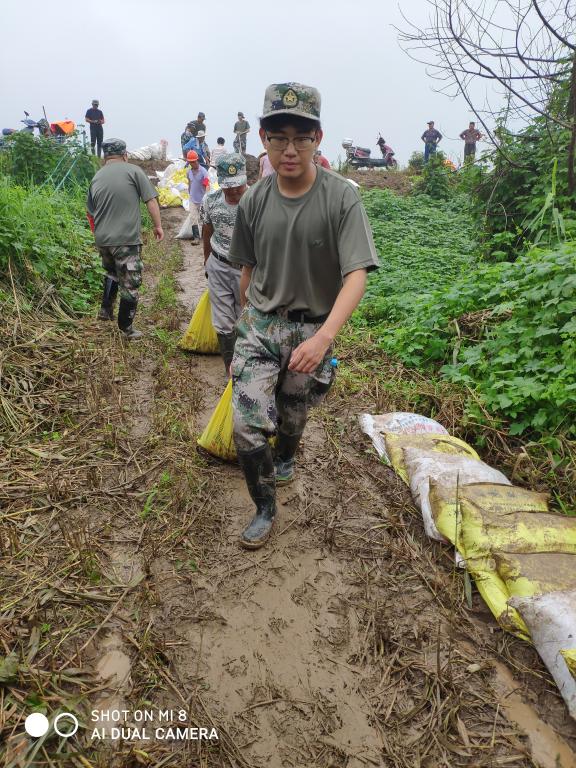 容不得半点耽搁,放下行李,我们直奔江堤。此时天色已晚,但堤上却灯火通明,一片繁忙景象,挖掘机紧张作业,挥舞铁锹、扛着沙袋的人流不断。看到这一幕,我不由的攥紧了双拳,迅速投入了战斗。铁锹与沙土的碰撞声,挖掘机发出的轰隆声,货轮驶过的鸣笛声……在夜幕下汇聚成一首催人奋进的战歌。铁锹此刻变得轻盈顺手,沙袋似乎也没那么沉重,我忘记了疲劳、忘记了饥饿,与其他民兵一道,从晚上8点半到凌晨两点,连续作业五个多小时,成功堵住了渗漏,并将数百米的堤坝用沙袋增高了一米,险情得以排除。