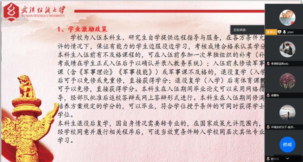 为鼓励广大学生积极响应国家号召,根据湖北省《关于做好2020年度征兵宣传工作的通知》精神,环境学院副书记刘园美及辅导员陆续开展了大学生征兵动员大会,并参加了各班征兵主题班会系列活动。