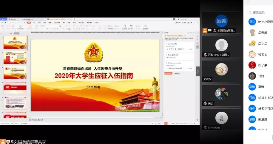 为激发大学生报名参军的积极性,提升兵源素质,推进国防和军队的现代化建设,2020年6月14日,环境学院开展了线上毕业生征兵入伍宣传讲座,讲座由刘园美副书记主讲,16级全体毕业生参加。