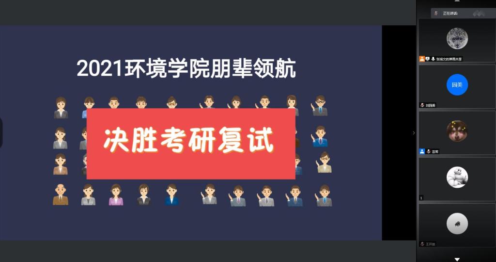 为更好地帮助考研学子进行复试准备,3月21日晚,环境学院组织开展了“决胜考研复试”的朋辈领航线上经验分享会,考取华中科技大学、南京师范大学、电子科技大学的三位学长詹铭志、王昭泰、王开放为同学们提供了针对性指导。学院副书记刘园美、辅导员刘文祥参加了会议。