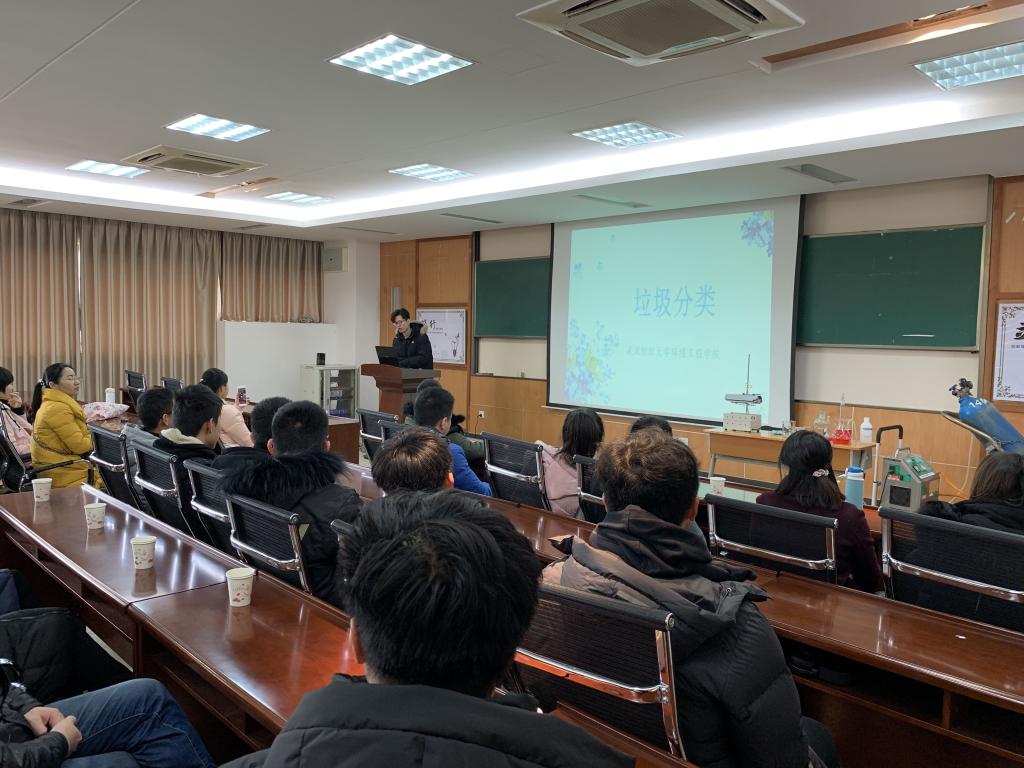 同学们首先来到三楼报告厅,来自纺大环境学院的研究生邹忠伟经过精心准备,为同学们作了一场《垃圾分类》的科普宣传。他从什么是垃圾分类、为什么提倡垃圾分类、如何进行垃圾分类以及分类后如何处理等方面引导大家,垃圾虽然无处不在,但只要每个人从自身做起,把纸张、塑料、橡胶、瓶罐等有用物质从垃圾中分离出来单独投放,把废电池、废灯管、废药品、废油漆桶等对人体健康或者自然环境有害的废弃物适当处理,就可以实现资源的合理利用、变废为宝。他叮嘱同学们,垃圾分类是一项长期而艰巨的任务,甚至需要几代人的不懈努力才能成功。