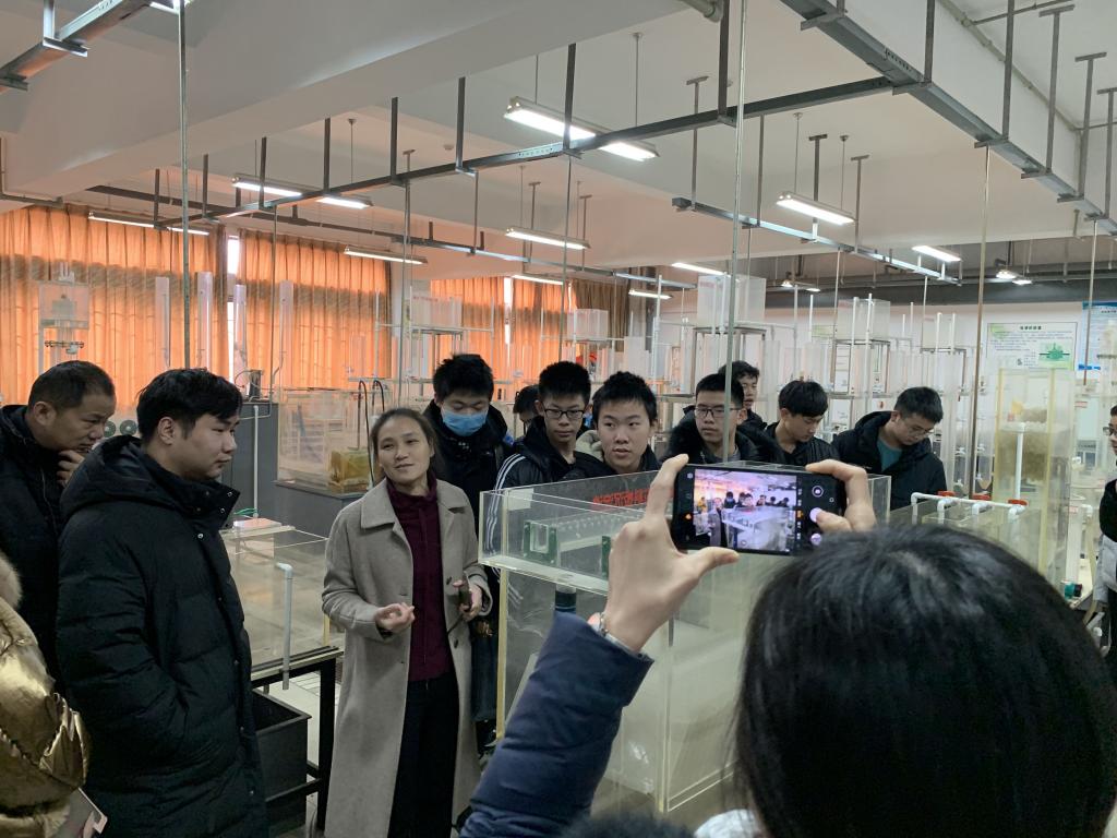 在大型水处理实验室和水污染控制实验室,施银桃老师给同学们介绍了水厂、污水厂的工艺流程,以及水厂的混凝、沉淀池、污水厂曝气池等水处理构筑物,形象生动地展示了污水处理的整个过程,深深的触动了同学们节水、护水的神经。施老师以学院湖北省“挑战杯”特等奖、全国二等奖获得者左诗语同学为例告诉大家,兴趣是最好的老师,左诗语四年如一日潜心科研,终产出了累累硕果,勉励同学们自立自强、刻苦钻研、学好本领,力争对人民、对社会有所作为。