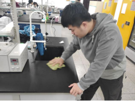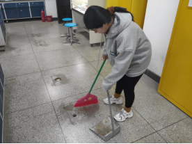 上午九点,全班学生进行分组,在老师的指导下,开始认真打扫实验室。志愿服务的工作主要包括整理实验台桌子、扫地和清细仪器。志愿者们团结协作,最终圆满的完成任务。为确保实验室的安全,我们又细致的对药品的摆放、电炉放置及门窗的关闭进行了一一的检查。