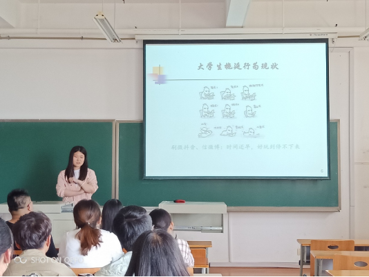 李老师首先向同学们介绍了拖延的行为现状及其带来的危害,随后,她结合生活中的实例生动形象的剖析了造成了拖延症的主要原因。李老师就改变拖延给出了几点建议:一是寻找共同奋斗的小伙伴一起解决拖延症;二是通过延迟满足和激发正能量的方法来提高自控能力;三是改变不合理的信念寻找积极的自我。